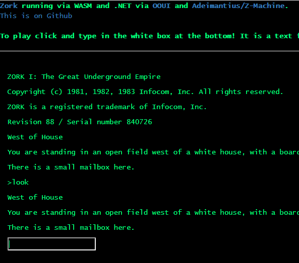 Naturally I didn't want to spend a lot of time creating my own ZMachine thus I googled and I found this Adeimantius Z-Machine. Downloaded it and ported it over to .Net core which was super simple. Ran it as a console app and it worked! I knew at some point I would need HTML DOM elements talking to this thing so I was going to need to change it.